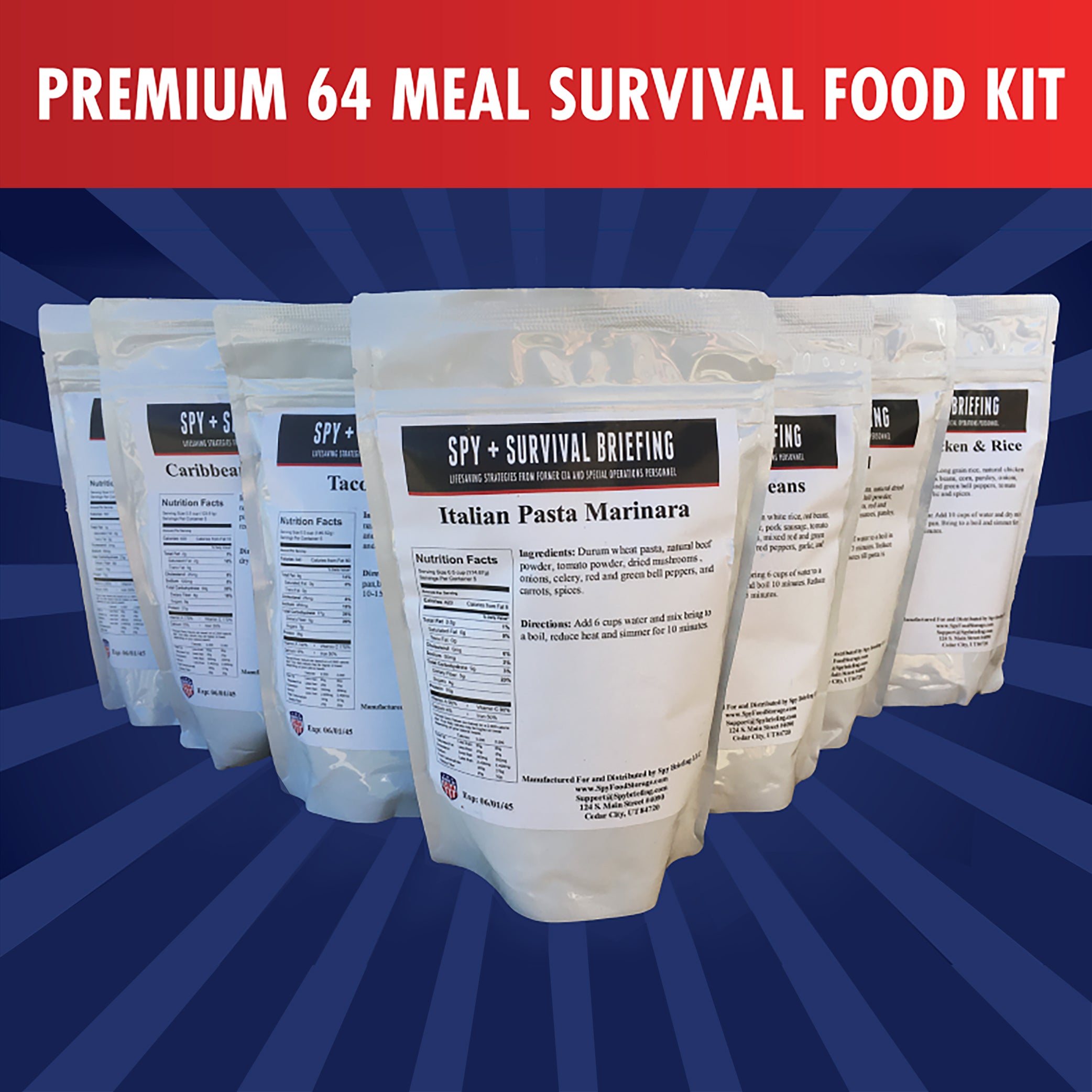Get the original and famous 64-meal survival food kit that started it all. This contains a total of 64 prepared servings per kit. Each kit is only $249 - or just $3.89 per serving for this premium survival food. The meals in this kit include Beef Skillet Dinner, Cajun Rice and Beans, Italian, Pasta Marinara, Southwest Chicken and Rice, BBQ Beef Meal, Taco Rice Skillet, Goulash, and Caribbean Rice and Beans.
